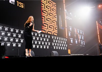 PALCO PRINCIPAL – PLENÁRIA: TOTALMENTE PENSADA PARA TRANSMITIR A SOLIDEZ DE 15 ANOS DE TRAJETÓRIA, A PLENÁRIA FOI PROJETADA COM INSPIRAÇÃO DIRETA EM FORMAS GEOMÉTRICAS DANDO A SENSAÇÃO DE ROBUSTEZ E ALTO IMPACTO. CONSTRUÍDA COM 5 PAINÉIS DE LED PARA TRANSMISSÃO DE CONTEÚDO, SEU FORMATO SUSTENTOU TODAS AS ATRAÇÕES PRINCIPAIS MAIS DEZENAS DE LEARNING SESSIONS REALIZADAS SIMULTANEAMENTE.